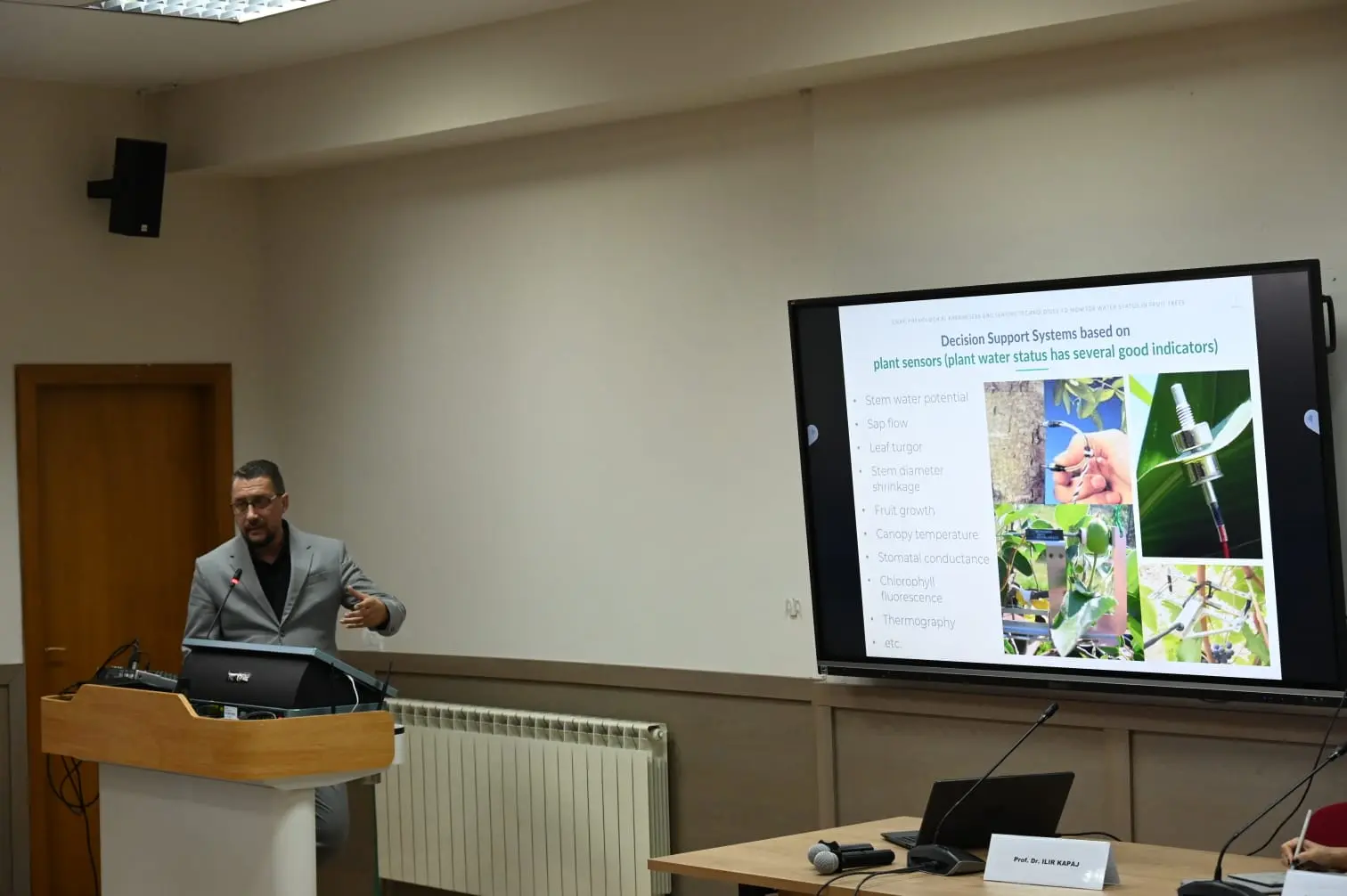 Prof. Endrit Kullaj nga Universiteti Bujqësor i Tiranës prezantoi studimin mbi përdorimin e parametrave fiziologjikë dhe teknologjive të sensing-ut për monitorimin e statusit të ujit tek pemët frutore, si një qasje moderne për menaxhimin e ujitjes.