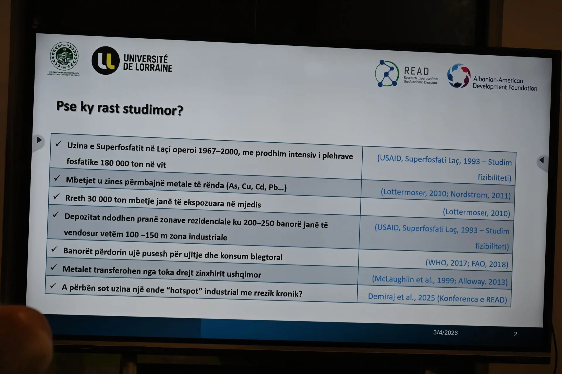 Projekti u prezantua hollësisht nga Dr. Erdona Demiraj, koordinatore e projektit, e cila ka punuar së bashku me studiueset Dr. Irena Duka dhe Dr. Nereida Malo. Studimi trajtoi profilizimin e ndotjes nga metalet e rënda dhe ndikimin e saj në ekosisteme dhe në shëndetin e njerëzve. Ndikimi mjedisor i ish-uzinës së superfosfatit në Laç vazhdon të jetë prezent edhe pas gati cerek shekulli pasi kjo uzinë është mbyllur duke sjellë efekte të drejtpërdrejta tek zonat përreth.