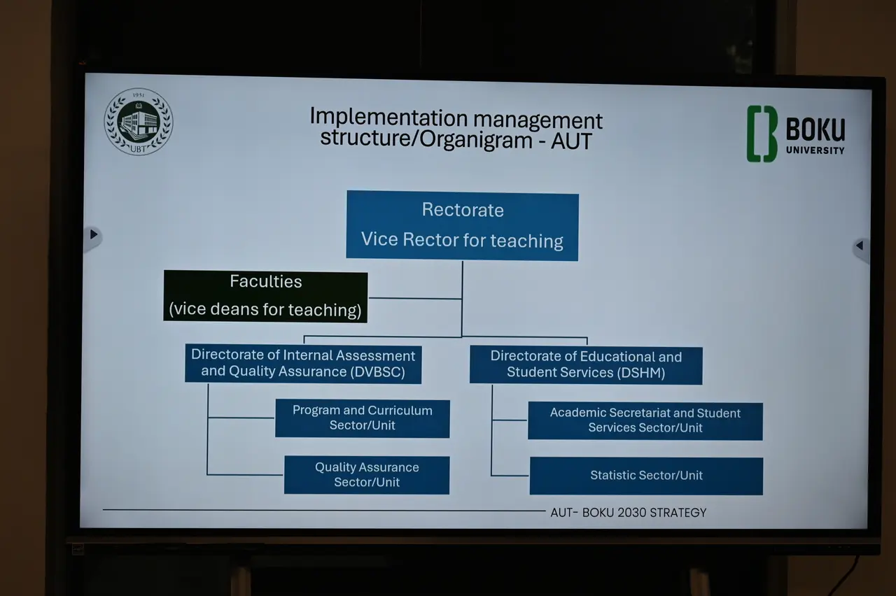 In this session, the management structure for the implementation of study programs at the Agricultural University of Tirana was discussed. The institutional organizational chart was presented, outlining clear coordination between the Rectorate and the Vice-Rector for Teaching, the faculties through the vice-deans for teaching, as well as the relevant directorates for quality assurance, student services, and statistics. The aim is to ensure a structured process for the development, monitoring, and continuous improvement of study programs, in line with the AUT–BOKU 2030 strategy.