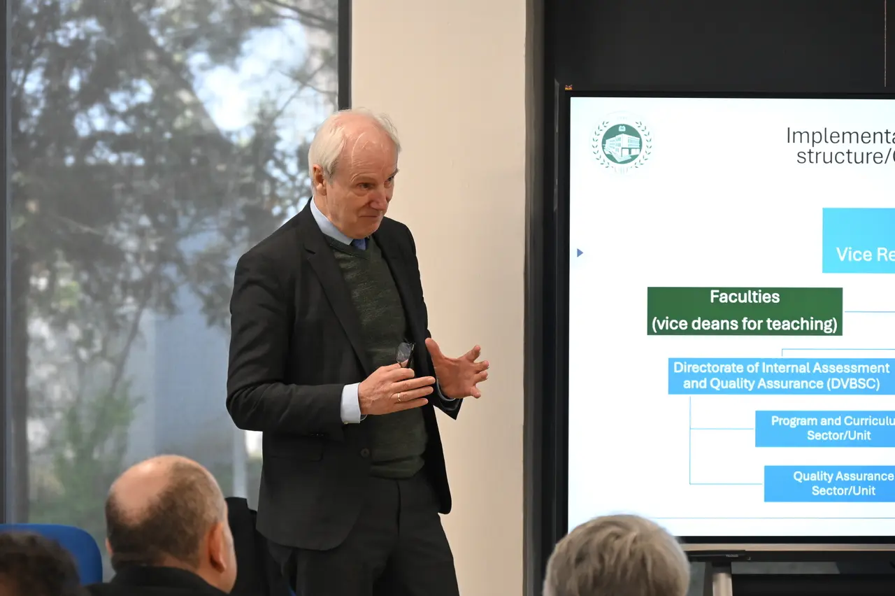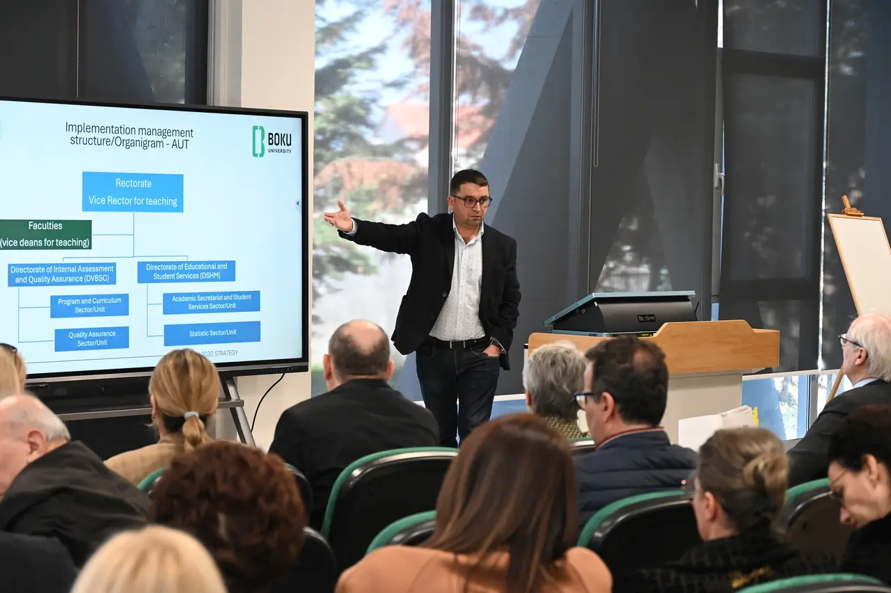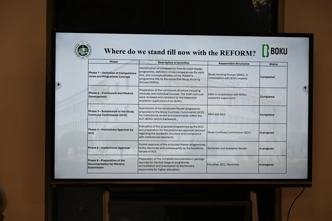 The Vice-Rector for Teaching at AUT, Prof. Dr. Ilir Kapaj, presented a summary of the revised Bachelor’s and Master’s programs, as part of the academic reform currently being implemented at the university with the assistance of experts from BOKU University.