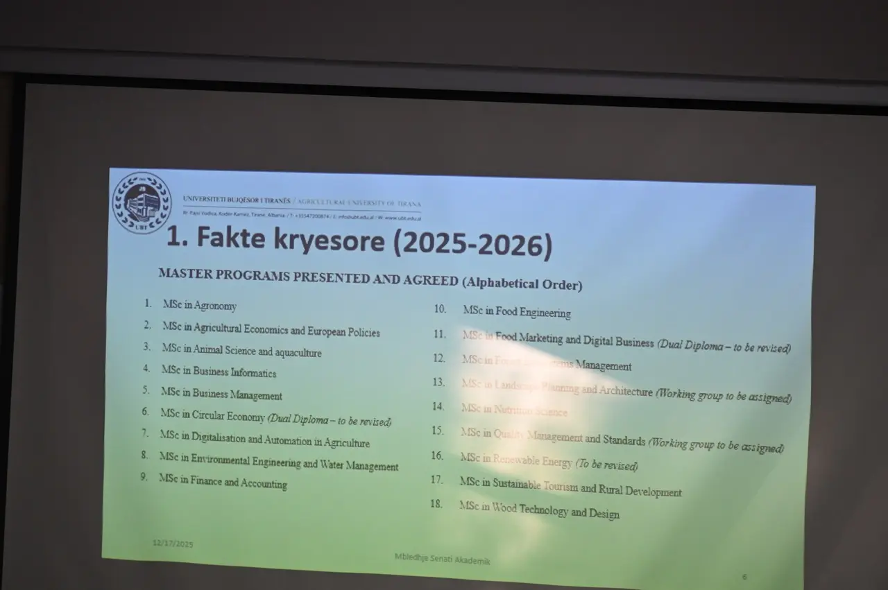 Në përmbyllje të analizës vjetore për vitin 2025, Universiteti Bujqësor i Tiranës zhvilloi Mbledhjen e Senatit, ku grupet e punës prezantuan arritjet kryesore të institucionit, sfidat e evidentuara si dhe prioritetet për vitin e ardhshëm.