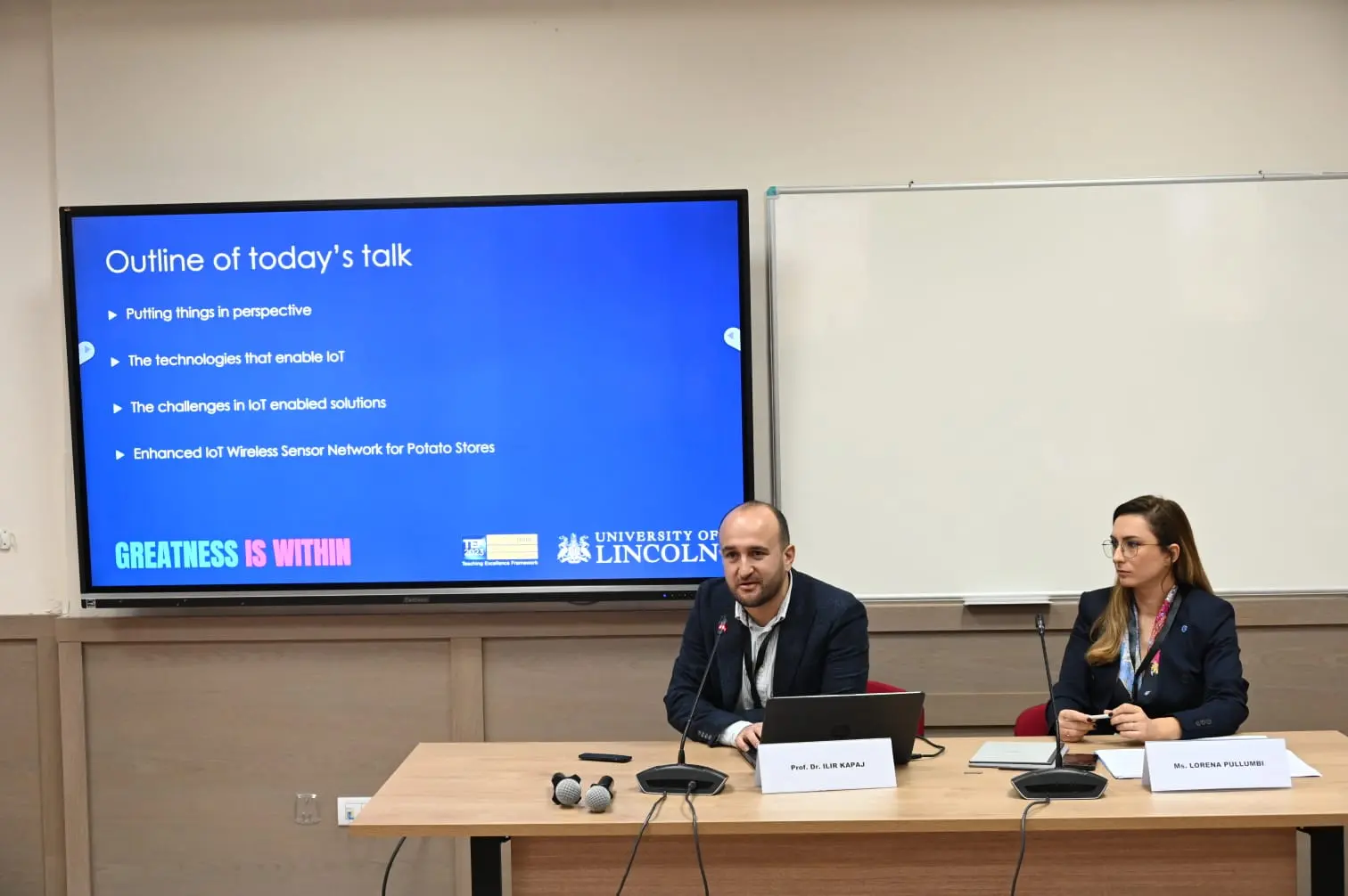Prof. Edmond Nurellari nga Universiteti i Lincoln prezantoi një projekt inovativ mbi përdorimin e rrjeteve të sensorëve pa tela dhe integrimin e AI me IoT për ruajtjen e patateve në shkallë industriale.