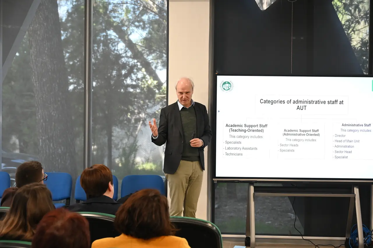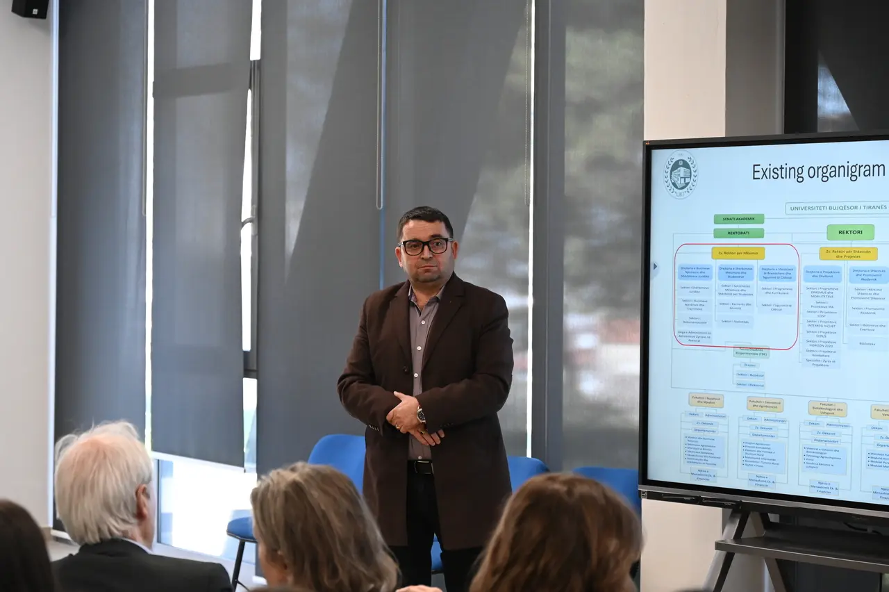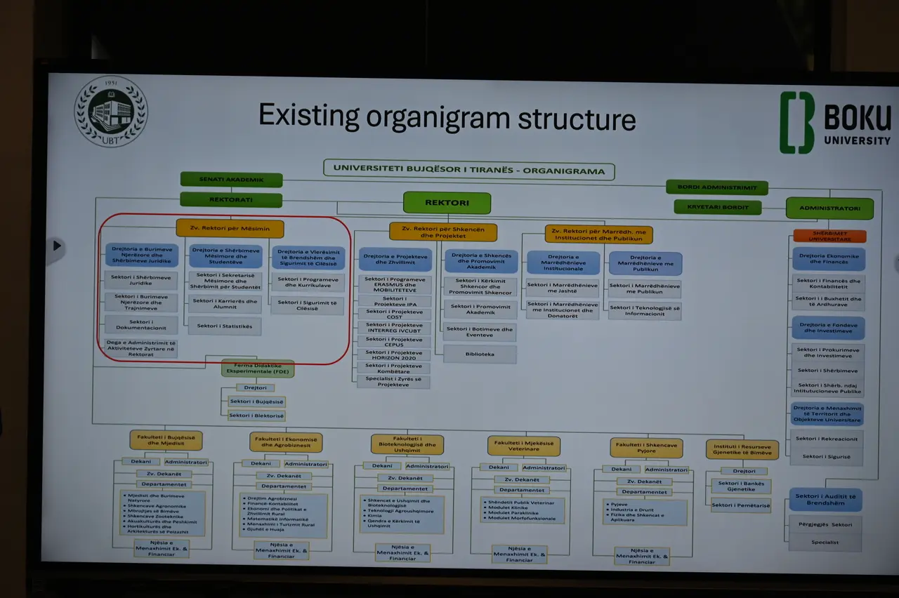Dita e dytë nisi intensive me një sesion të dedikuar për administrimin universitar, ku Drejtoresha e Burimeve Njerëzore Etleva Shore nga UBT dhe Anika Stork e Prof. Hubert Hasenauer nga BOKU prezantuan situatën aktuale në Universitetin Bujqësor të Tiranës. Në këtë sesion të parë morën pjesë zëvendësrektorët, dekanët si dhe përfaqësues të administratës së universitetit, përfshirë drejtues të financave, burimeve njerëzore dhe zyrës së projekteve. Diskutimet u fokusuan në analizën e proceseve aktuale administrative, identifikimin e nevojave dhe objektivave të institucionit, si dhe në përcaktimin e hapave të mëtejshëm për përmirësimin e funksionimit të strukturave administrative.
