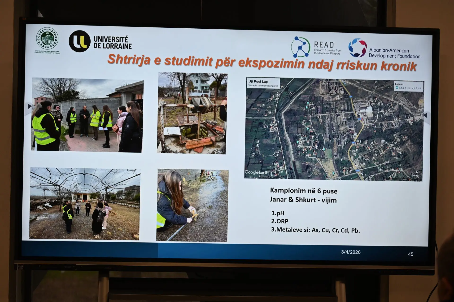 Projekti u prezantua hollësisht nga Dr. Erdona Demiraj, koordinatore e projektit, e cila ka punuar së bashku me studiueset Dr. Irena Duka dhe Dr. Nereida Malo. Studimi trajtoi profilizimin e ndotjes nga metalet e rënda dhe ndikimin e saj në ekosisteme dhe në shëndetin e njerëzve. Ndikimi mjedisor i ish-uzinës së superfosfatit në Laç vazhdon të jetë prezent edhe pas gati cerek shekulli pasi kjo uzinë është mbyllur duke sjellë efekte të drejtpërdrejta tek zonat përreth.