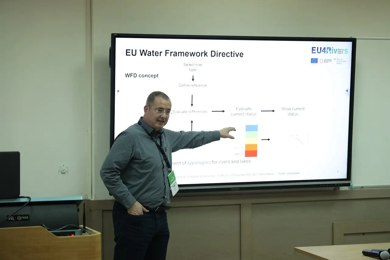 Pas tij, Prof. Guenter Langergraber nga BOKU, Austri prezantoi temën: “Monitoring i Cilësisë së Ujit në përputhje me Udhëzimin e BE-së për Ujin në Shqipëri”, duke theksuar nevojën për sisteme të avancuara monitorimi dhe standarde të integruara për mbrojtjen e resurseve ujore.