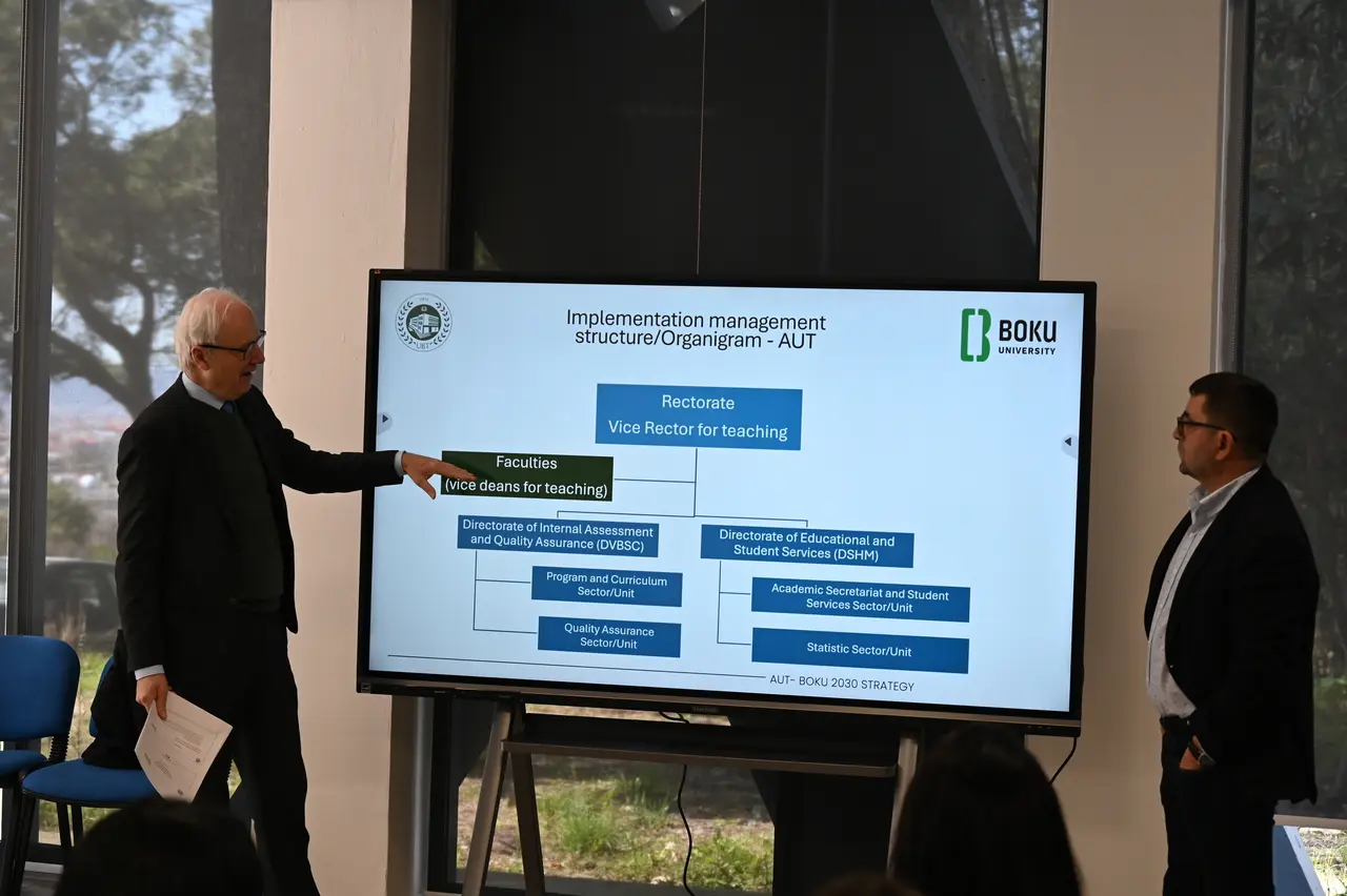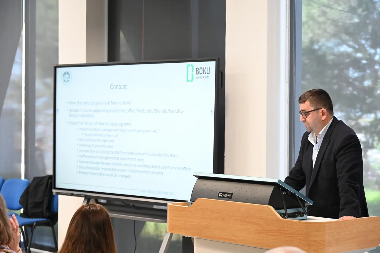 The Vice-Rector for Teaching at AUT, Prof. Dr. Ilir Kapaj, presented a summary of the revised Bachelor’s and Master’s programs, as part of the academic reform currently being implemented at the university with the assistance of experts from BOKU University.